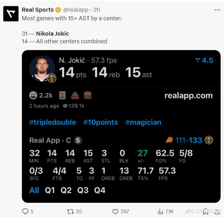 4.约基奇第31次15+助攻,其余中锋合计14次;
