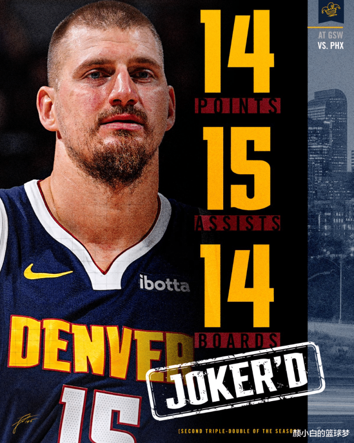 回到主场的第一场比赛约基奇一反常态,他首节没有任何一次出手专心串联球队,次节才出手第一次,约基奇的无私帮助球队大比分领先太阳队,约基奇应该是知道自己外线的手感还没有修正过来所以主动减少进攻。