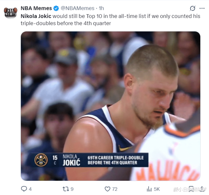 5.约基奇三节69次三双也进入历史三双榜单前十;