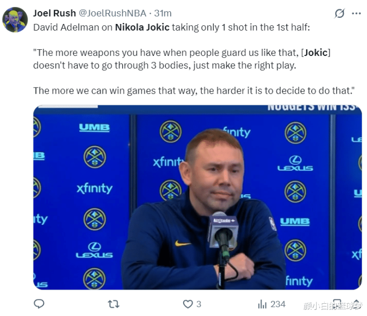 赛后掘金主帅大卫-阿德尔曼谈到了约基奇的发挥:约基奇上半场只有1次出手是因为他阅读对方的防守,当所有人都在包夹他对他严防死守,他就不必硬要自己进攻,他有诸多武器可以帮助球队,越是这样我们全队越打得轻松。